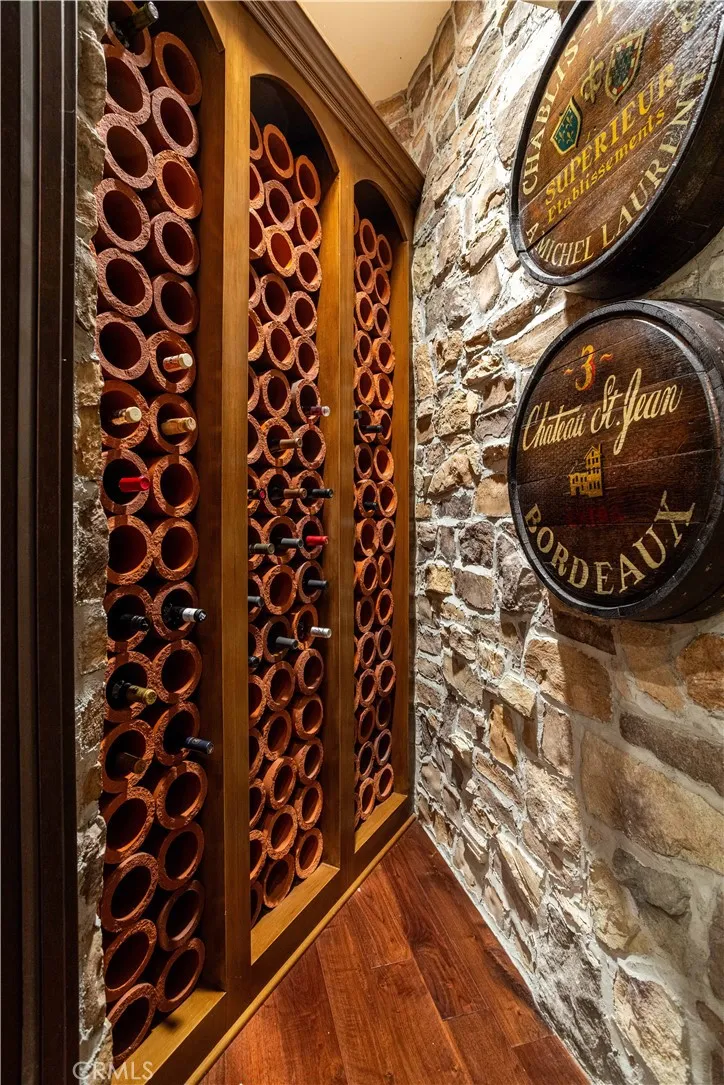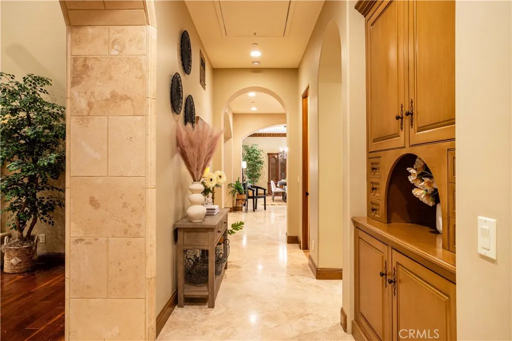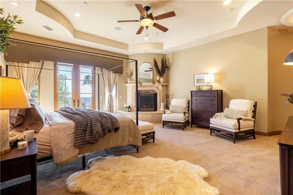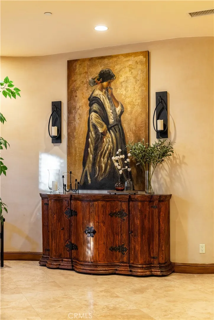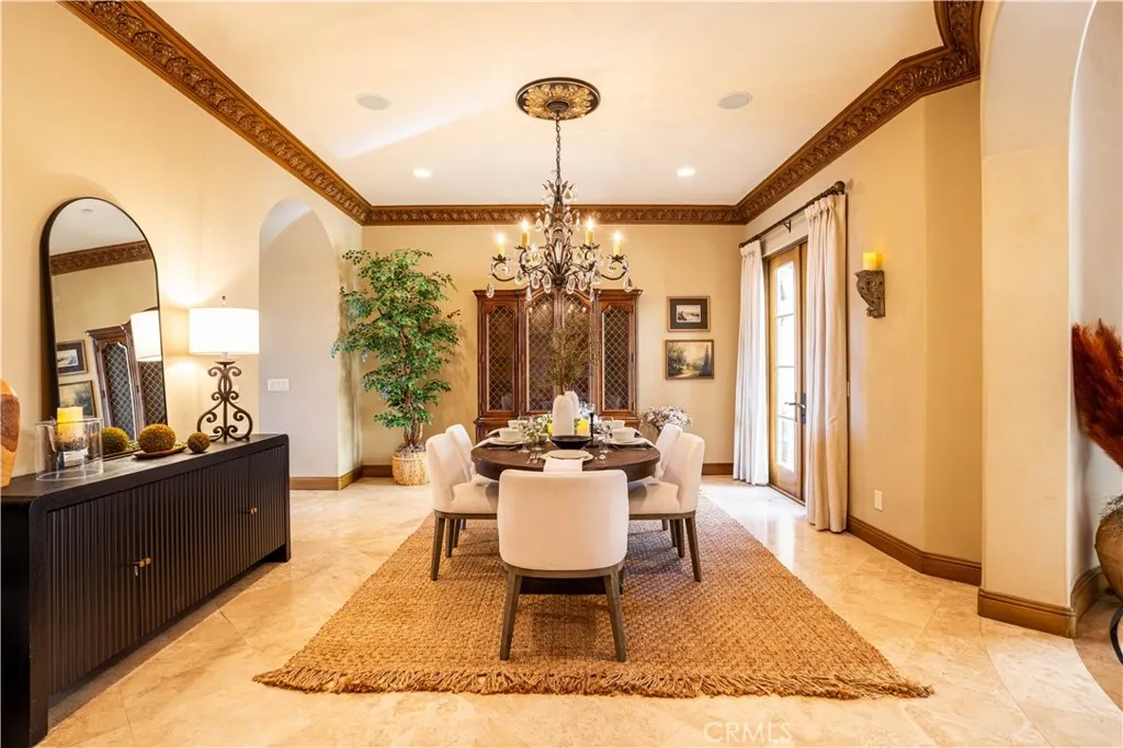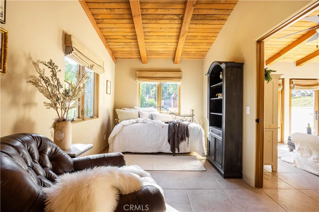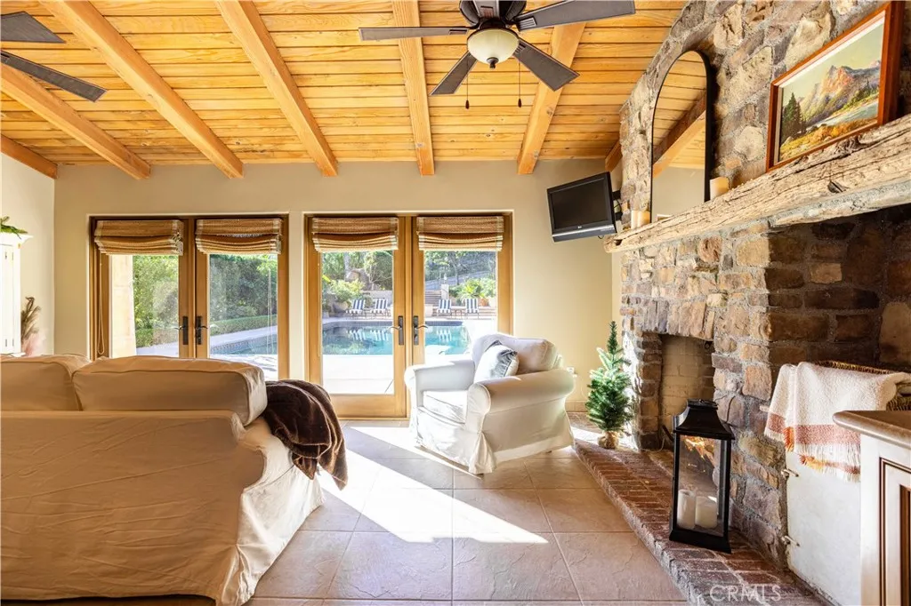Perched majestically in the foothills of Monrovia, this one-of-a-kind Italian villa-inspired estate offers an unparalleled lifestyle defined by privacy, luxury, and sweeping city views. Sprawling across 13.12 acres, the property features a masterful 4,968 sq. ft. single-level main residence where architectural elegance meets seamless indoor-outdoor flow. The journey begins in a tranquil courtyard with a soothing fountain, leading through a grand foyer into a floorplan designed for sophisticated entertaining. The formal living room, marked by soaring vaulted ceilings and a massive stone double-sided fireplace, transitions into an expansive family room. This space is a connoisseur's dream, equipped with a full wet bar, wine cellar, wine fridge, and built-in cappuccino machine. Both rooms feature French doors opening to a vast covered patio framing breathtaking vistas. At the heart of the home lies a chefs kitchen, meticulously appointed with professional-grade appliances, double ovens, a warming drawer, and a large center island with a new cooktop. Granite countertops, custom cabinetry, and a walk-in pantry provide abundant storage, while the breakfast area and built-in desk offer everyday functionality. The kitchen flows gracefully into the formal dining room, perfect for large-scale gatherings. The primary suite is tucked privately at the rear of the home, featuring a fireplace, cedar-lined walk-in closet, and a spa-like bathroom with dual vanities, a soaking tub, and a multi-head steam shower. Three additional bedrooms, two full bathrooms, and two powder rooms ensure comfo
