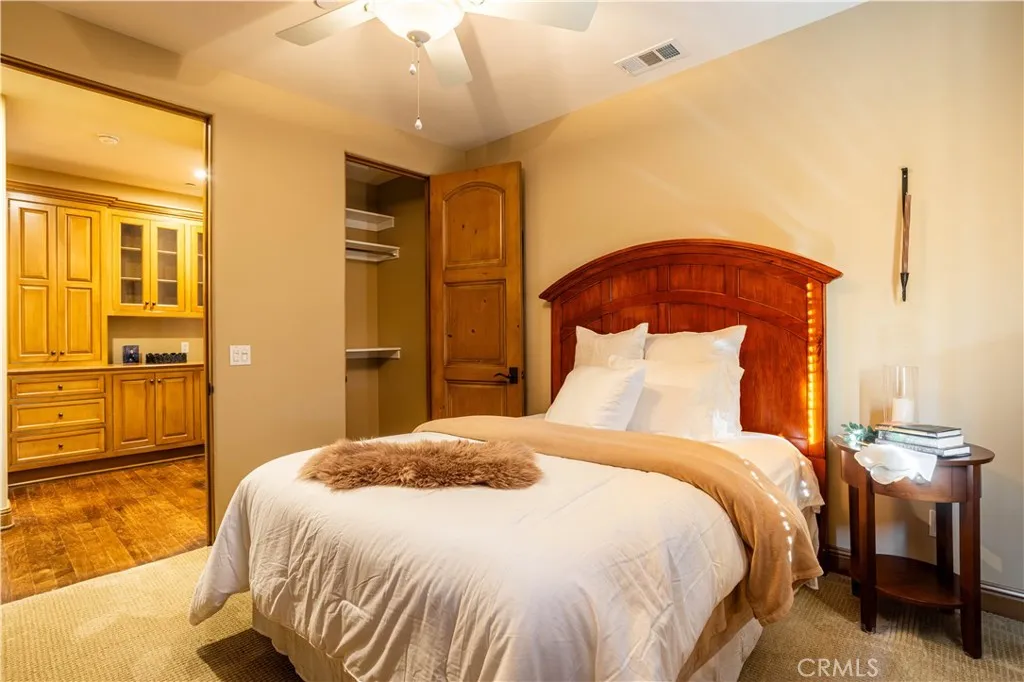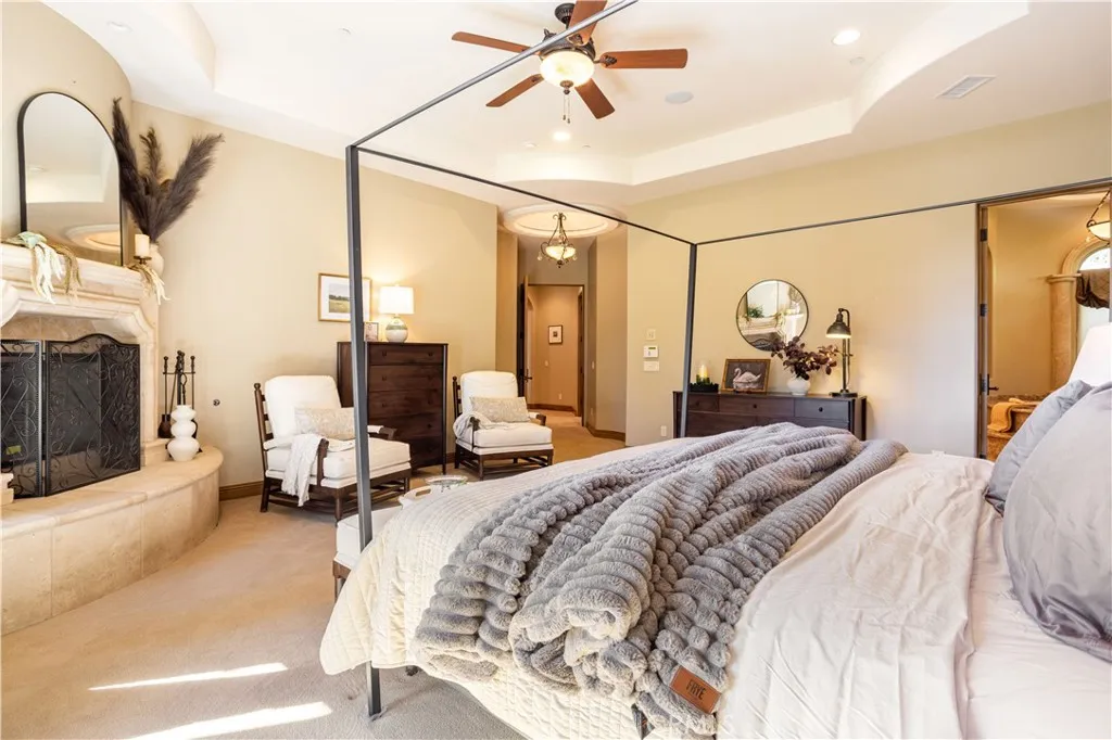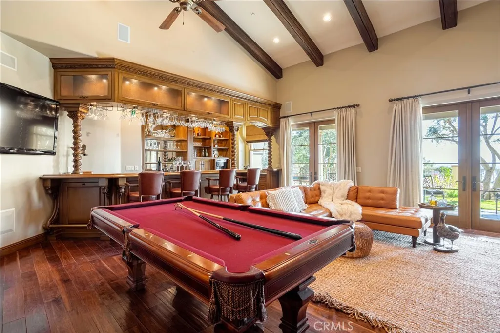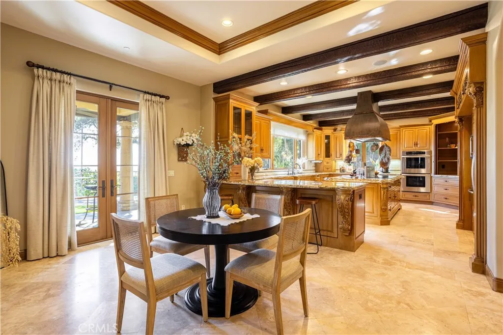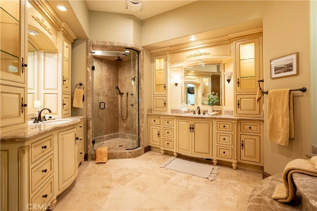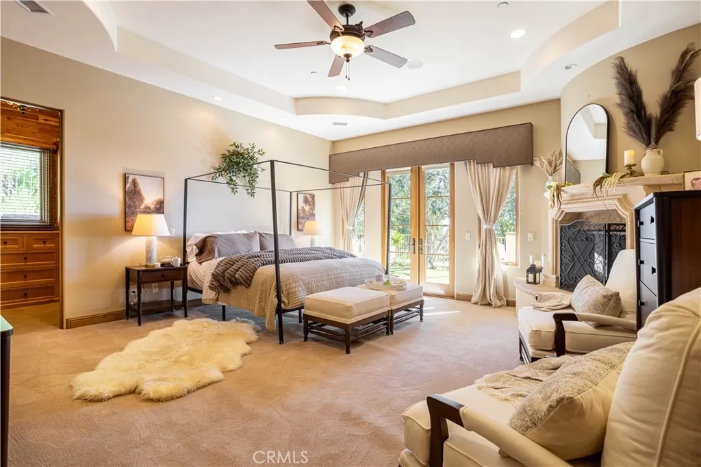 Perched majestically in the foothills of Monrovia, this one-of-a-kind Italian villa-inspired estate offers an unparalleled lifestyle defined by privacy, luxury, and sweeping city views. Sprawling across 13.12 acres, the property features a masterful 4,968 sq. ft. single-level main residence where architectural elegance meets seamless indoor-outdoor flow. The journey begins in a tranquil courtyard with a soothing fountain, leading through a grand foyer into a floorplan designed for sophisticated entertaining. The formal living room, marked by soaring vaulted ceilings and a massive stone double-sided fireplace, transitions into an expansive family room. This space is a connoisseur's dream, equipped with a full wet bar, wine cellar, wine fridge, and built-in cappuccino machine. Both rooms feature French doors opening to a vast covered patio framing breathtaking vistas. At the heart of the home lies a chefs kitchen, meticulously appointed with professional-grade appliances, double ovens, a warming drawer, and a large center island with a new cooktop. Granite countertops, custom cabinetry, and a walk-in pantry provide abundant storage, while the breakfast area and built-in desk offer everyday functionality. The kitchen flows gracefully into the formal dining room, perfect for large-scale gatherings. The primary suite is tucked privately at the rear of the home, featuring a fireplace, cedar-lined walk-in closet, and a spa-like bathroom with dual vanities, a soaking tub, and a multi-head steam shower. Three additional bedrooms, two full bathrooms, and two powder rooms ensure comfo