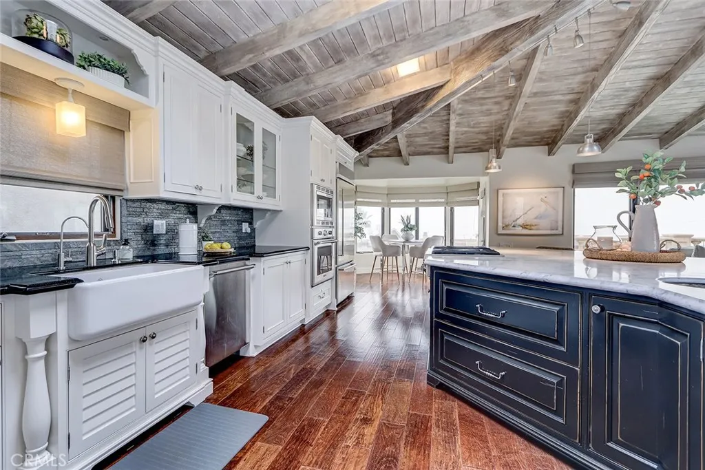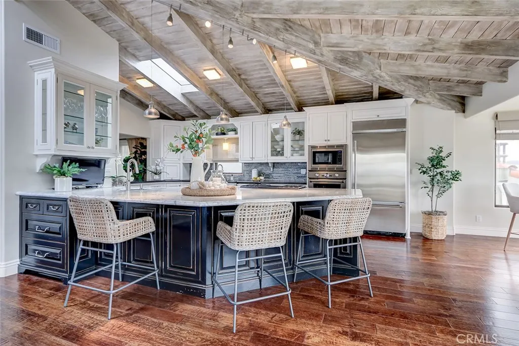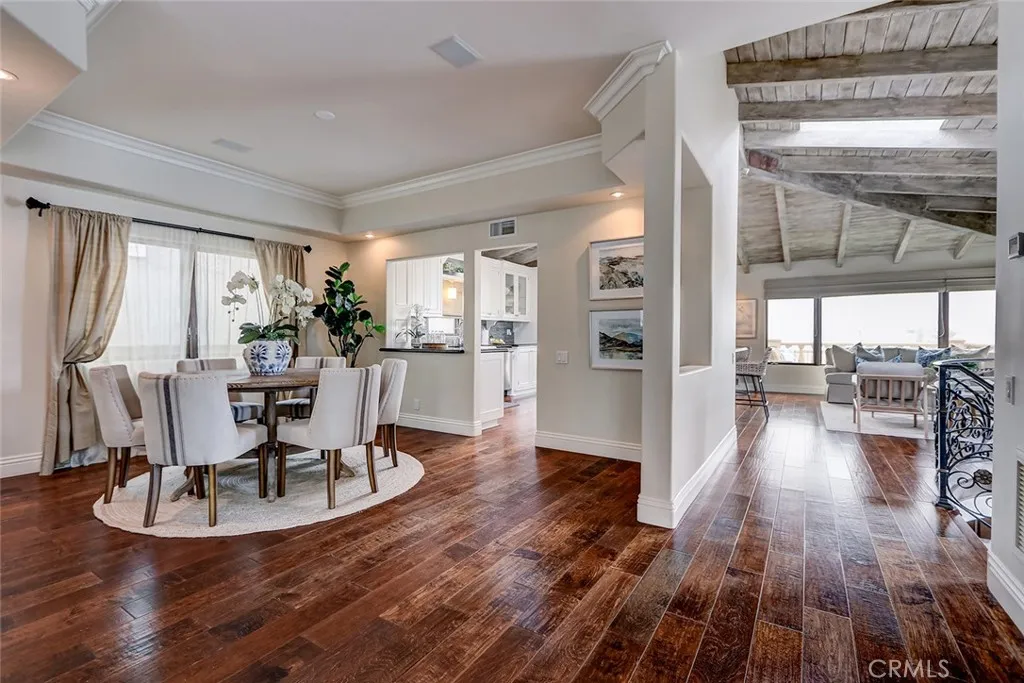 A rare offering in coveted North Hermosa Beach this Ocean View single family home is just two blocks from the sand, in the desirable "between the piers" location. A beautifully appointed coastal residence that captures sweeping ocean views and offers a thoughtfully designed floor plan ideal for refined beachside living. The upper level is designed for both entertaining and everyday enjoyment, featuring an expansive living room with fireplace that opens to a generous ocean view deck perfect for sunset gatherings. The living space flows effortlessly into a beautifully finished kitchen with custom cabinetry, stone countertops, breakfast bar, and an inviting breakfast nook filled with natural light. Also on this level are a tucked away family room and an adjacent home office that could easily serve as a fourth bedroom, with a three quarter bath nearby. The entry level hosts three bedrooms including a serene primary suite with private deck, walk in closet, and a spa inspired bath designed as a peaceful retreat. Two additional bedrooms open through French doors to a private garden courtyard, creating a tranquil outdoor space for guests or quiet relaxation. Additional highlights include a two car garage with extensive storage plus four additional parking spaces, an exceptional convenience this close to the beach. Enjoy sweeping ocean views, a thoughtfully designed floor plan, and one of the South Bays most desirable North Hermosa locations.