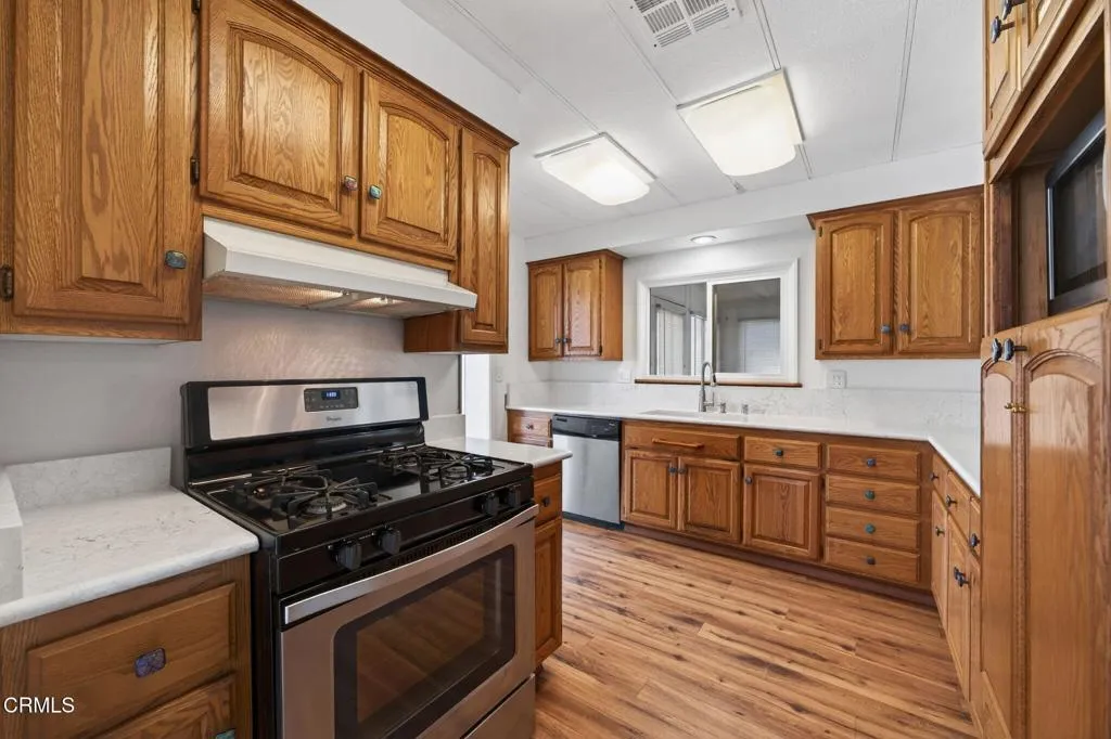 Well maintained 55+ home in Buenaventura Mobile Home Estates offering 1,464 sq ft of comfortable living space. This 2 bedroom, 2 bath home features a spacious primary suite with walk-in closet and double sink vanity area. Enjoy a bright living room, dining area, and an updated kitchen with quartz countertops, plus a versatile bonus room, sunroom, and laundry room. Additional highlights include dual pane windows, an upgraded A/C unit, and a private yard with a 220V outdoor outlet. Community amenities include a clubhouse with library and kitchen, swimming pool, indoor spa, corn hole, and a variety of outdoor activities.