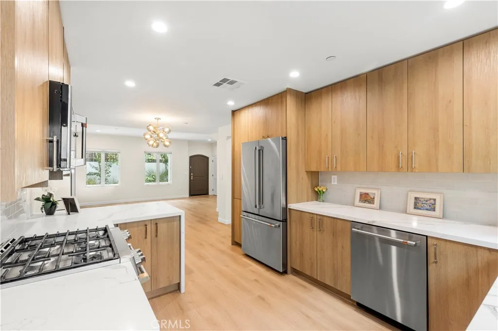 Introducing a beautifully designed modern Spanish-style townhouse in the heart of Arcadia, located within one of the most sought-after communities and award-winning school districts. This thoughtfully crafted residence offers 4 bedrooms and 3 bathrooms, with a spacious and functional layout across two levels. The open-concept living area is bright and inviting, featuring high ceilings, recessed lighting, and durable SPC flooring that is both water- and scratch-resistant. Custom-designed stair railings add a refined architectural touch. The gourmet kitchen showcases sleek European-style cabinetry, a waterfall peninsula, and premium Caf appliances, including a versatile microwave with air fry and baking functionsperfect for everyday living and entertaining. The primary suite is designed for comfort and relaxation, featuring a well-appointed closet and a spa-inspired bathroom with a freestanding soaking tub, rainfall shower, dual vanities, and LED-lit mirrors. Additional highlights include an in-unit laundry room, designer lighting fixtures, and smart home features such as a Nest thermostat for enhanced comfort and efficiency. The exterior features smooth stucco finishes and a classic tile roof, blending modern elegance with timeless appeal. A gated garage provides added security, while each unit includes private storage. EV charging stations are available to accommodate modern lifestyles. Ideally located near top-rated schools, dining, shopping, and local amenities, this home offers both convenience and tranquility.