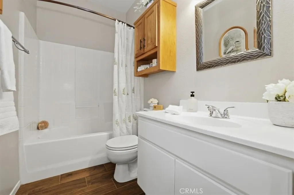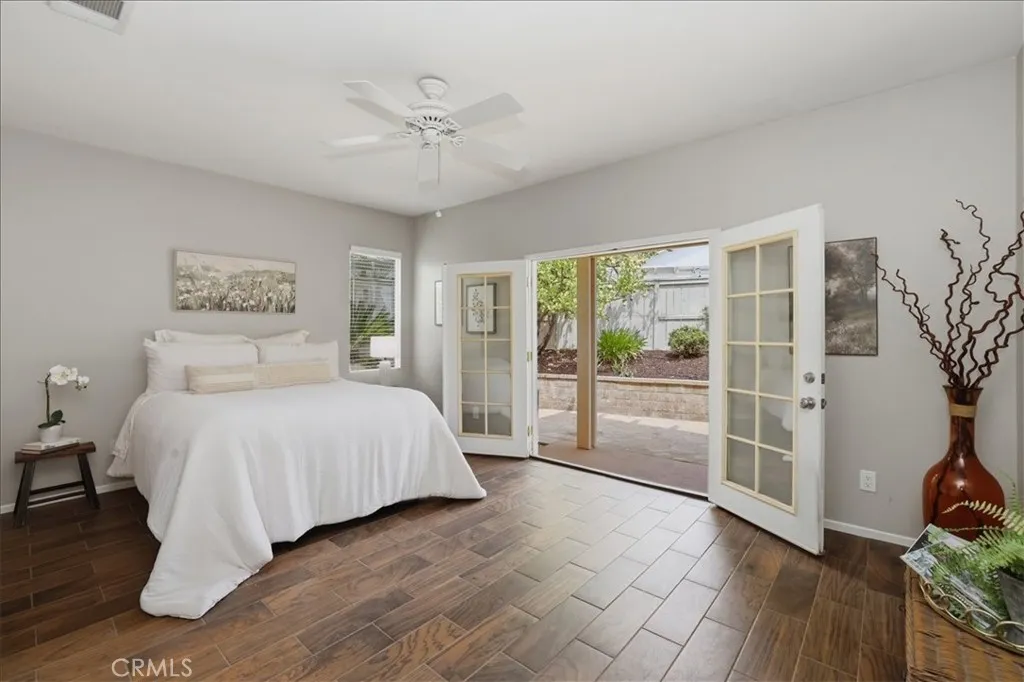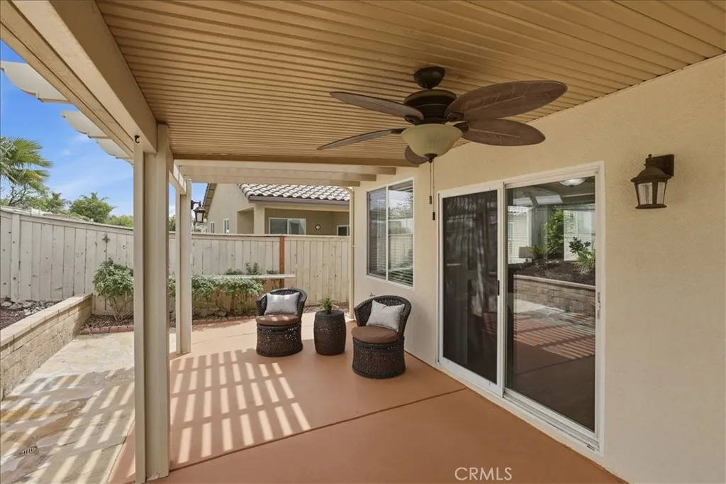 Serenity awaits at The Oasis, Menifees premier resort-style senior community! This beautifully upgraded two-bedroom, two-bathroom gem is the perfect blend of modern elegance and easy living. From the moment you see the newly painted exterior, youll know youve found something special. Step inside to an airy, open floor plan featuring high ceilings, recessed lighting, and stylish wood-look tile throughout. The heart of the home is the stunning kitchen, boasting fresh quartz countertops, a new sink and faucet, stainless steel appliances, and freshly painted cabinetry. Whether youre cooking a feast or enjoying the sunlit dining area, this space shines. Relax in the expansive great room, complete with a cozy fireplace and a large media niche ready for your big-screen TV. When its time to unwind, the primary suite offers a peaceful retreat with high ceilings and French doors that open to your serene back garden. Youll love the massive walk-in closet and the ensuites dual-sink vanity and large step-in shower. Outside, your low-maintenance backyard features an aluminum patio cover and a raised flowerbed with a gorgeous, fruit-bearing lemon tree. Best of all, the HOA handles your front landscaping, watering, and trash. Life at The Oasis feels like a permanent vacation. Enjoy the opulent clubhouse, fitness center, pool with cabanas, and courts for tennis, pickleball, and shuffleboard. Located just minutes from Menifee Lakes Golf Course, shopping, and dining, this gated community truly has it all.