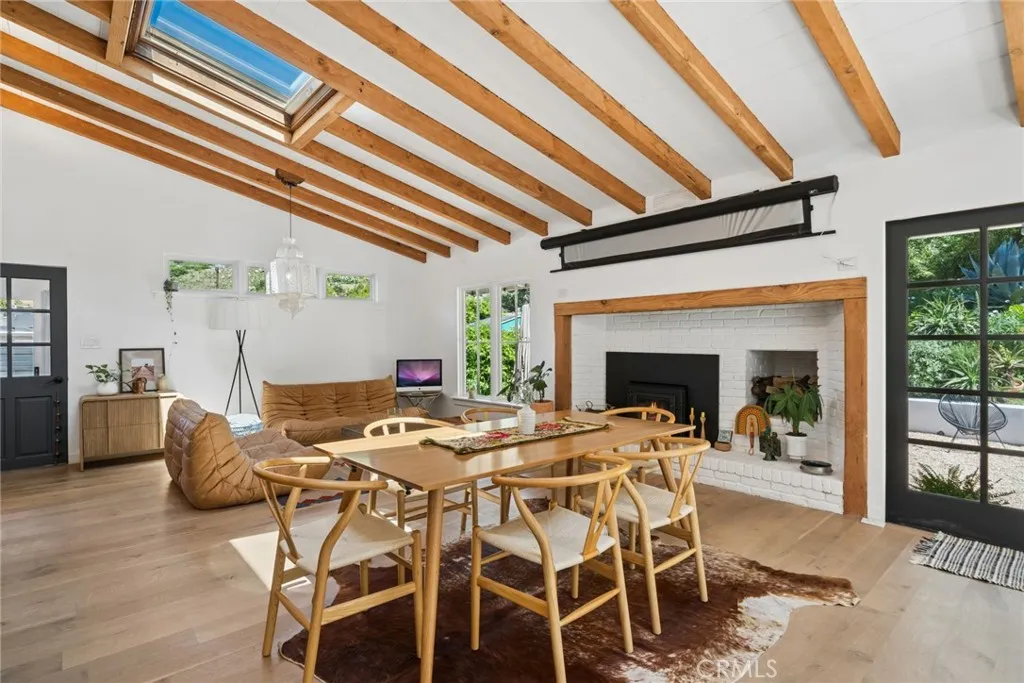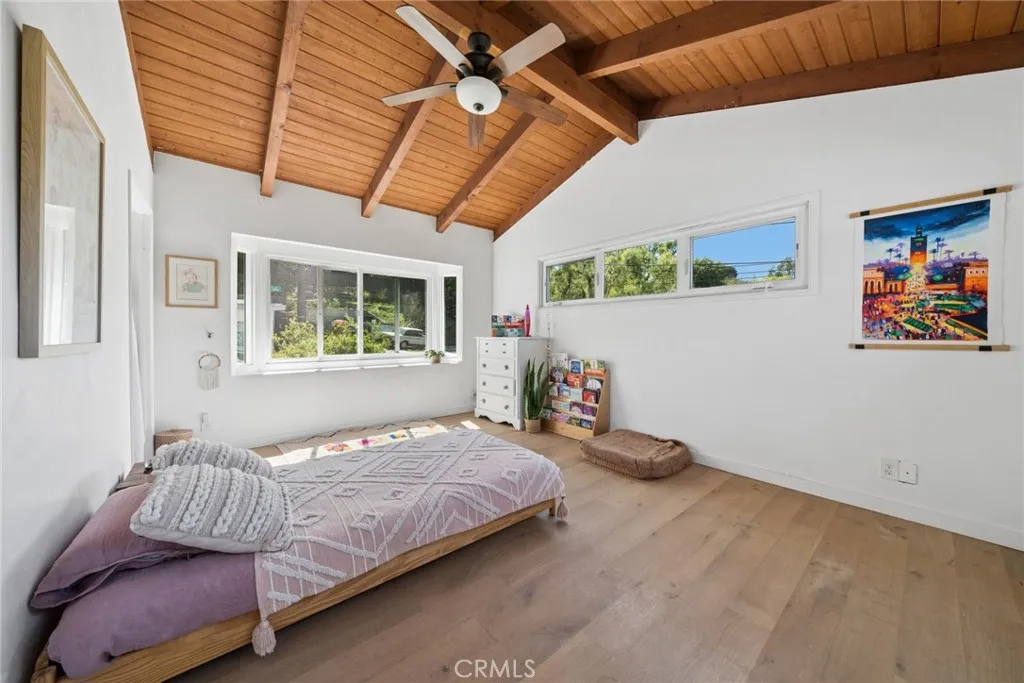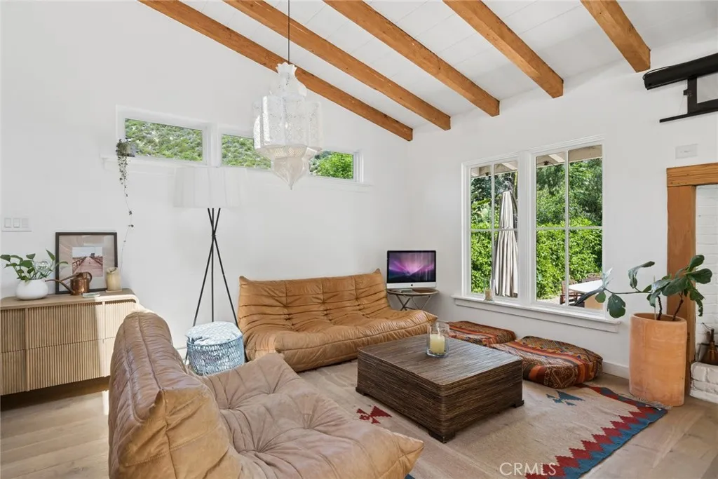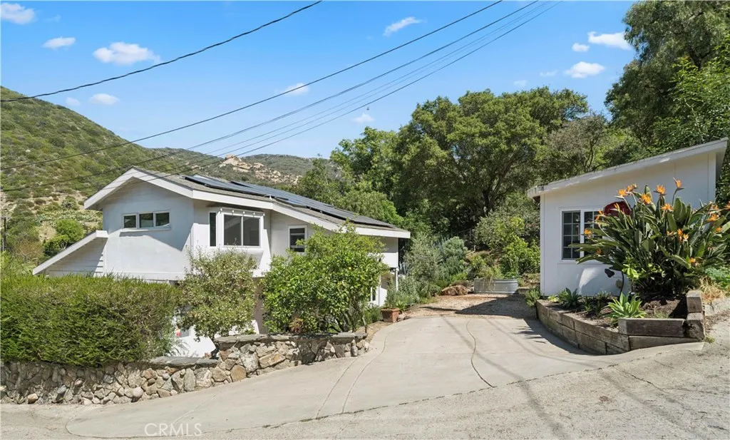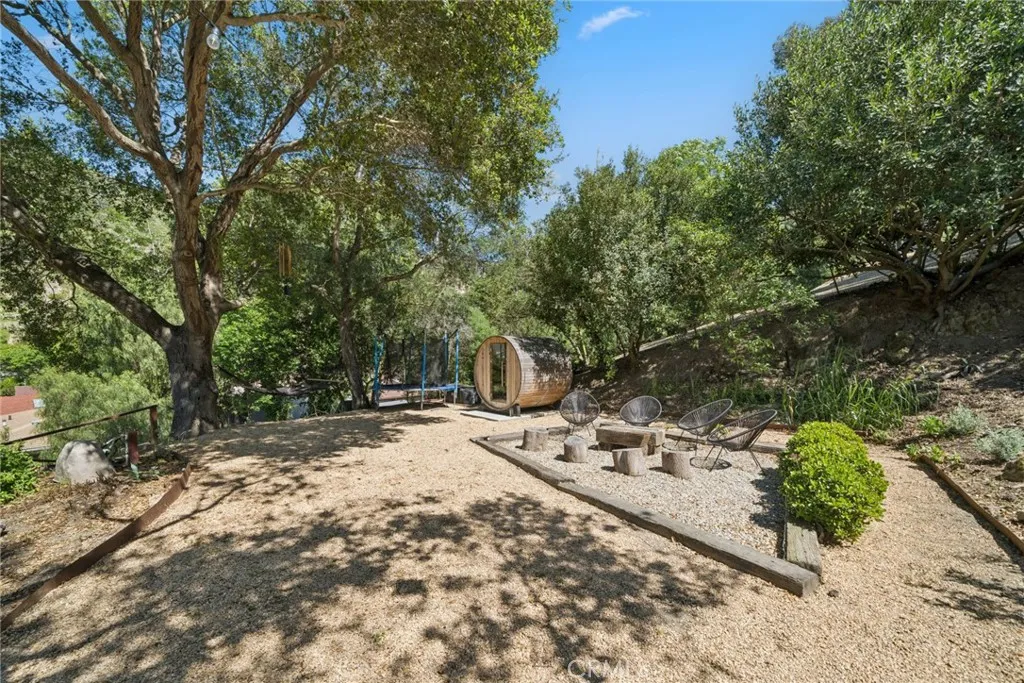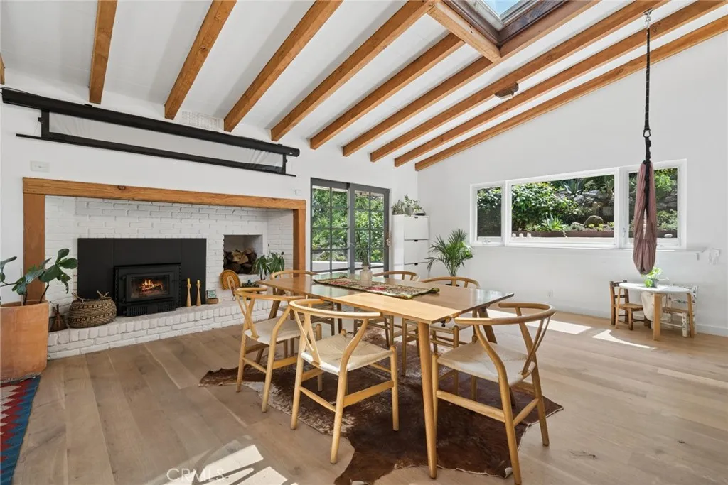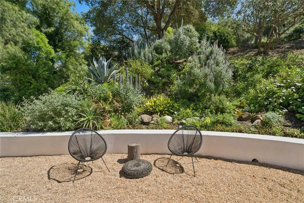 Tucked into the serene enclave of Canyon Acres, a quiet, no-through-traffic community, this beautifully remodeled, fully furnished home is a rare opportunity to truly live immersed in Laguna Beach, not just visit it. Set on nearly a third of an acre shaded by large, mature oak trees and surrounded by lush gardens, the property offers a sense of privacy and natural beauty that's increasingly hard to find. Canyon hill views stretch from the main living areas and the upstairs master suite, where a dedicated ensuite office makes working from home feel like anything but work. Inside, the home is warm, clean, and considered; soaring beamed ceilings, rich wood floors, and a wood-burning fireplace give the main living space a grounded, organic character that's both elevated and livable. The kitchen is equipped with a reverse osmosis water system with electrolyte re-addition, because the details here actually matter. The floor plan flows intuitively; a private guest bedroom on the main level offers flexibility and separation, while two bedrooms upstairs, including the master retreat with views and an ensuite office, provide a quiet retreat from the rest of the home. A separate ADU on the property adds yet another layer of versatility - ideal for a home office, studio, or creative space. Rounding it out: a dedicated laundry room, a barrel sauna, solar and driveway parking for three. Step outside and the property opens up expansive, private outdoor spaces made for morning coffee under the oaks and long evenings around the fire. Direct trail access from the neighborhood connects to La