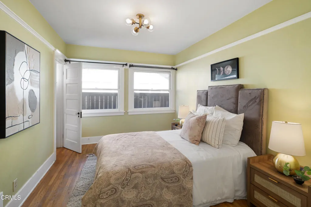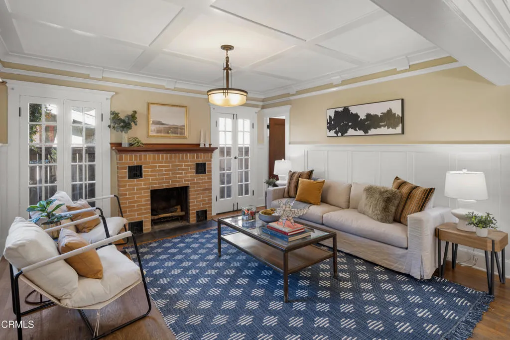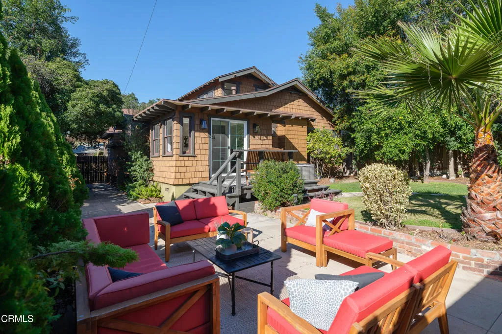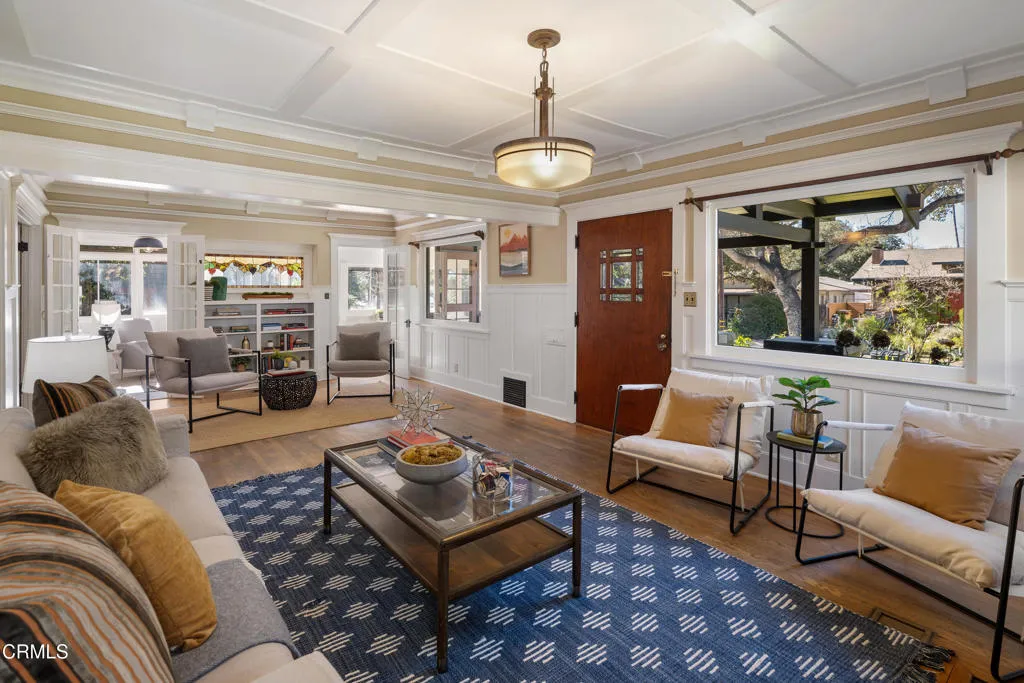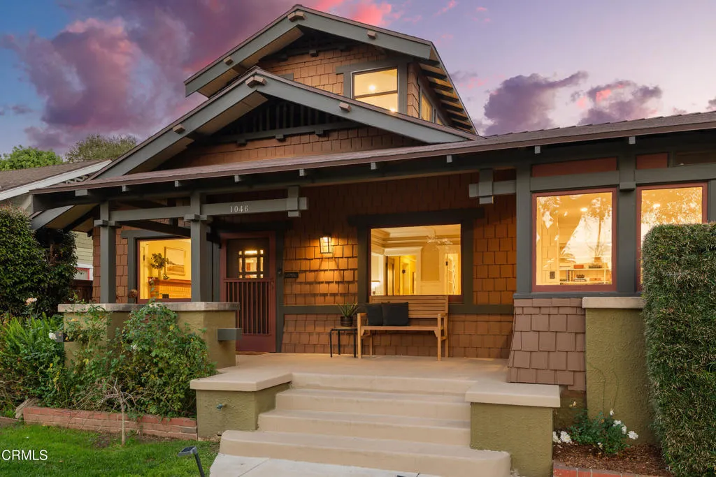 NEW PRICE--This exquisite three bedroom, two bath, 1923 square foot, 1915 Craftsman Airplane Bungalow, with an office and bonus crafts room or an additional study, has been lovingly remodeled and restored throughout. The house, built by Walter A. Waldlock, is an idyllic reflection of the arts and crafts movement while still offering a welcoming floor plan for entertaining or for enjoying the best of the California lifestyle. The interior is filled with period grace and details including hardwood floors, wide baseboards, rich wood moldings, crossbeam ceilings, artisan woodwork, elegant lighting, as well as custom built-ins, all reflecting the majesty of the era. As you step up to the wide, inviting porch, you are beckoned in via a stately front door that leads into the expansive living room with a central fireplace framed by two sets of French doorsallowing the light to stream in. From there you enter the formal dining room that has a charming bump out that houses a majestic antique sideboard. This adjoins the sun-lit,impeccably renovated kitchen, with high-end appliances, gleaming cabinetry, an oversized two-sided farmhouse sink and stunning quartzite counters. There are three spacious bedrooms with two bathrooms that have been beautifully updated with marble tile, aged brass treated fixtures and gorgeous vanities all while remaining in keeping with the architecture of this highly desirable style. Additionally, there is a breakfast area and laundry room or multi-purpose space that steps out to the deep backyard. The lovely rear yard offers spaces for celebrating with friend